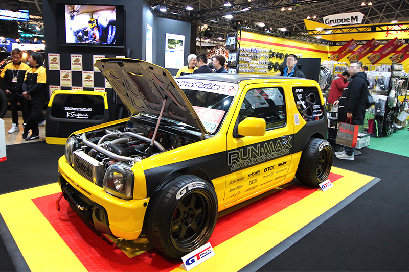 キノクニエンタープライズのブースは、例年以上の好立地です。噂のジムニーをはじめとして、さまざまパーツを展示販売しています。